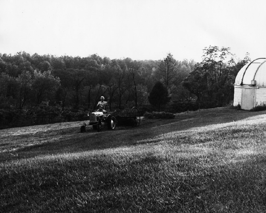 This photograph of Dr. Moore was taken at the Star Lane Observatory in 1972, just before the 52 cm telescope was removed to be rebuilt and installed at Moore Observatory. Dr. Moore's home was on the hill above this site, and here he is raking hay with his favorite Cub tractor.