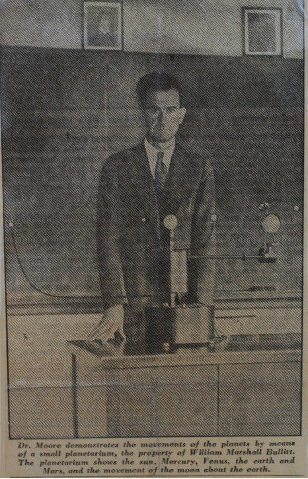 Dr. Moore gave public lectures about astronomy in 1936 and the ticket sales netted about $400, enough to purchase the Pyrex mirror blank from Corning that became the mirror of the original "Star Lane" Louisville Astronomical Society telescope.
