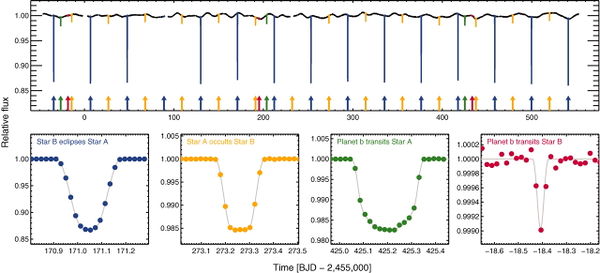 The first planet found orbiting two stars was Kepler 16b. The Kepler telescope finds planets by capturing the moment when they pass between us and their stars, blocking out a tiny fraction of the star's light (often less than 0.1%). These events allow astronomers to measure the size of the orbit, the diameter of the planet, and in some instances even the planet's atmosphere. For Kepler 16 the data look like this: