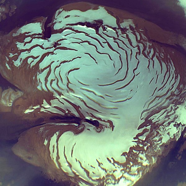 North Pole on Mars is covered with both water ice and dry (carbon dioxide) ice as seen by Mars Global Surveyor