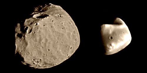 Mars' moons, Phobos and Deimos, appear to be captured asteroids. Phobos is tiny, about 1 / 140 th the size of our Moon, but so close to Mars it appears 1/3rd as wide as our Moon as it crosses the Martian night sky in about 4 hours. Phobos is closer to its planet than any other moon. Some day it will either impact Mars or break up and become a ring of debris.