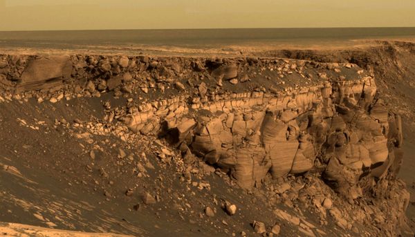 Similarly, layered rock revealed along edges of craters may have been deposited by dust storms, or by water, just as layered rock occurs in Kentucky where a shallow sea once came and receded.