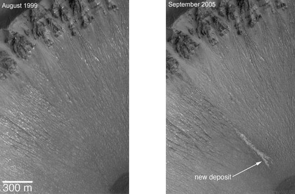 Warm ground temperatures also enable water beneath the surface to melt, and liquid water springs gush from the sides of craters, as seen by Mars Global Surveyor. Finding these changes is not the same as finding the water, though it seems to be strong evidence that water is there now.