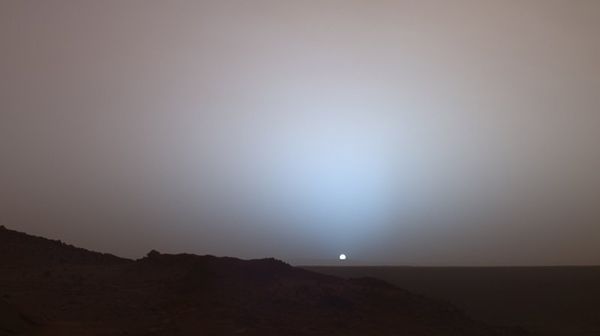 Sunset on Mars is unlike that on earth. The sky near the Sun is bluish, and the Sun is about half as wide as it appears from Earth.