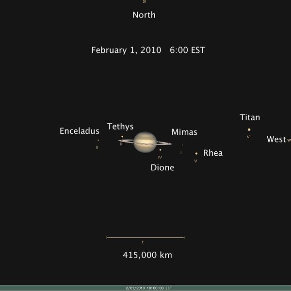 Saturn and some of its moons, as it appeared in February 2010. The horizontal line is a little larger than the distance from Earth to the Moon.