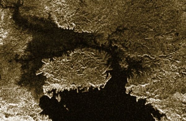 Hydrocarbon "seas", of methane and ethane look dark in radar.The largest is almost the size of the Caspian Sea or Lake Superior on Earth.