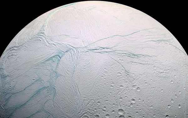 Enceladus, a mere 500 km in diameter, is only 1/7th the diameter of our Moon. It is relatively close to Saturn. Although its white icy surface reflects almost 100% of the Sun's light, beneath the surface tidal forces from Saturn's gravitational pull provide sufficient heat to create liquid water reservoirs that erupt in geysers. These jets spurt ice particles, water vapor and trace organic compounds, which have created a ring in Enceladus' orbit. There is speculation the water could harbor life in a satellite such as Enceladus, or Jupiter's Europa.