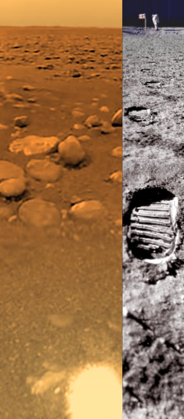 Titan's surface seen from the Huygen's lander is on the same scale as this image of Earth's Moon
