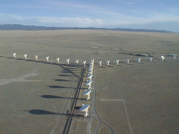 The Very Large Array of 27 radio telescopes is located 50 miles west of Socorro, New Mexico. Radio waves from radio galaxies, quasars, pulsars, remnants of supernovae, gamma ray bursts, radio-emitting stars, the Sun and planets, astrophysical masers, black holes, and hydrogen gas in the Milky Way galaxy and other galaxies. In 1989 the VLA was used to receive radio communications from the Voyager 2 spacecraft as it flew by Neptune. At its best configuration, the VLA has the resolution of the Hubble Space Telescope, but at radio wavelengths.