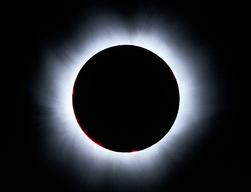 Above the chromosphere, the corona becomes a wind of thin gas that flows outward through the solar system. The corona is remarkably hotter than the surface of the Sun, with temperatures reaching 2,000,000 K. During a solar eclipse, when the Moon blocks the light of the photosphere, the white glow of the corona is visible to the eye.