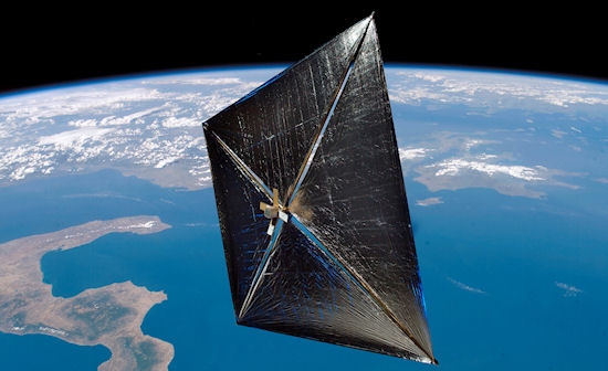 Sunlight, which may seem like gentle warmth to us, may someday reflect or "bounce" off giant mirror-like sails on spacecraft to propel them from Earth to other planets. Because there is no friction in the near-vacuum of space, the slight push from the pressure of light acts continuously, and a spacecraft with a solar-sail could steer an interplanetary trajectory without consuming fuel. Cosmos I, seen here, was the first attempt, but due to a malfunction of one of the combustion launch engines, it never made it into space. NASA's NanoSail-D unfurled the first solar sail in Earth orbit in January 2011.