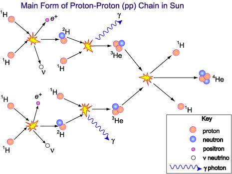 How many H atoms does it take to make one He atom in this process? Do a little counting and you'll see that the proton-proton chain consumes 6 H atoms, but it makes 2. So, the Sun converts 4 H atoms into 1 He atom every time the process occurs.