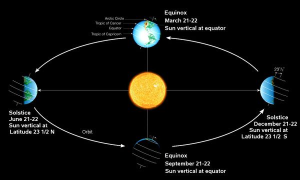 In the northern hemisphere, around June 21st is the summer solstice, the longest day of the year when the sun appears highest in the sky . The winter solstice, the shortest day of the year, is around December 21st. The equinoxes are when the days and nights are of equal length, around September 21st and March 21st. It takes time for the Earth to heat up and cool off, so that the warmest days follow the summer solstice, and the coolest days follow the winter solstice.