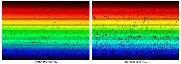 Can you tell the difference between the spectra of Procyon, a normal "main sequence" star, and Arcturus, a aging "red giant" star? Stellar spectra reveal not only the composition of a star, but also tell its temperature and how large it is.