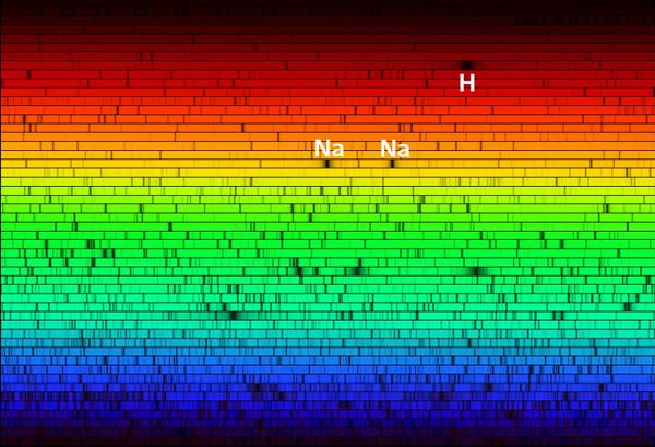 Here is a spectrum of the sun's light, made when sunlight is dispersed into its components by a diffraction grating. An atom may absorb or emit a photon of light only when it can change by exactly the energy of that photon. Each element has a pattern of energy changes determined by the structure of its atomic electrons. Photons, originating long before in the fusion processes of the Sun's core, pass through the outer layers of the Sun, and are absorbed if their energies match the pattern of the elements present. The distinctive pattern of absorption lines identifies the elements present in the Sun, in distant galaxies, or even in gas in interstellar space between us and the source of light.