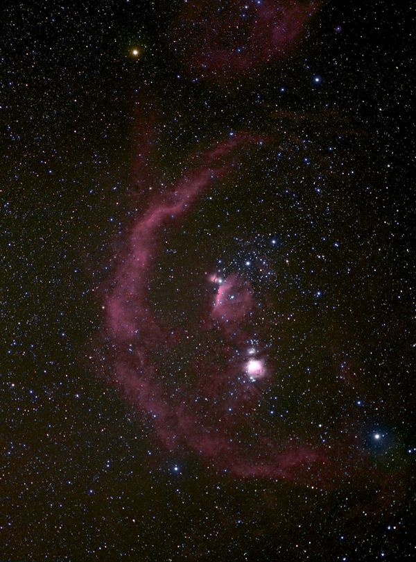 Can you find the constellation Orion, the red giant star Betelgeuse, Horsehead Nebula, Great Orion Nebula, and Barnard's Loop curving around the Horsehead and Orion Nebula?