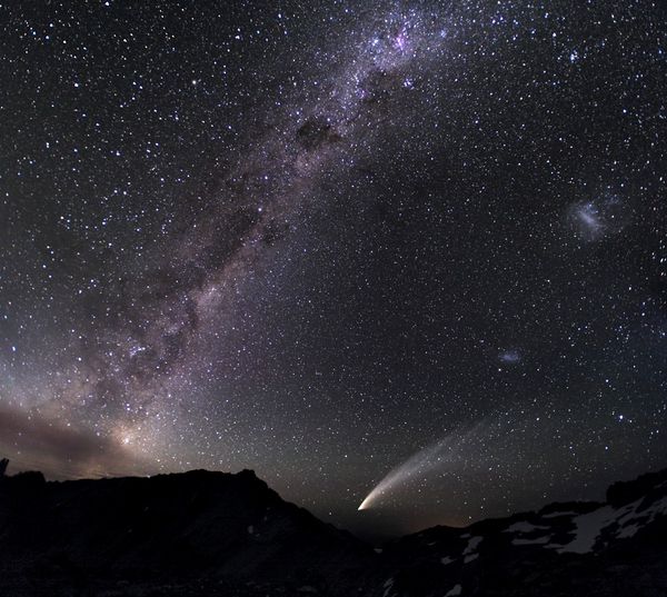 Milky Way with Large and Small Magellanic Clouds to the right as seen from the southern hemisphere. Comet McNaught is to the lower right. The comet is in our solar system. The stars are in our galaxy. The Large and Small Magellanic Clouds are nearby galaxies outside our Milky Way galaxy, about 160,000 and 200,000 ly away respectively.